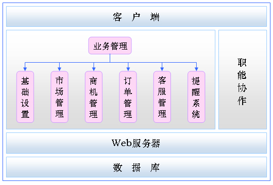 该系统主要包括市场信息管理(lǐ)、商(shāng)机管理(lǐ)、工作日志(zhì)、统计分(fēn)析(跟踪异常查询、商(shāng)机查询、工作日志(zhì)查询、客户拜访查询、丢单率分(fēn)析、销售漏斗分(fēn)析、机会分(fēn)析)等功能(néng)。