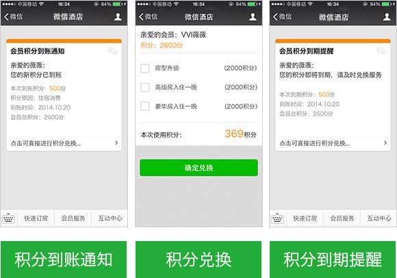 根据微信openID建立会员體(tǐ)系,告别工作人员推销和登记流程,在住店(diàn)流程中使用(yòng)微信或活动中接触酒店(diàn)公众号,即成為(wèi)酒店(diàn)“泛会员”(会员资料填写环节后置)通过微信“卡包”、微信消息等能(néng)力,对“泛会员”进行精准引导,升级会员等级,加强会员粘性。