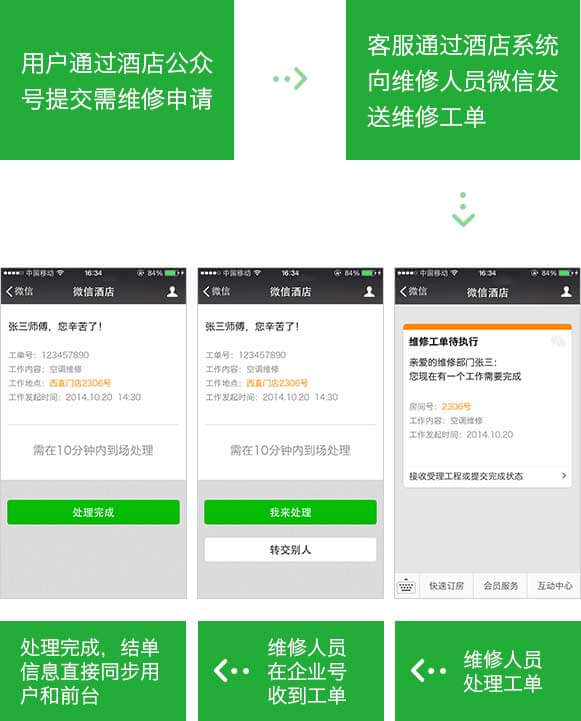 通过商(shāng)户公众号与商(shāng)户企业公众号的功能(néng)联动,完美连接客服问题的線(xiàn)上接收和線(xiàn)下处理(lǐ)问题。通过企业公众号同时可(kě)优化酒店(diàn)内部的通知管理(lǐ)和移动办公问题。